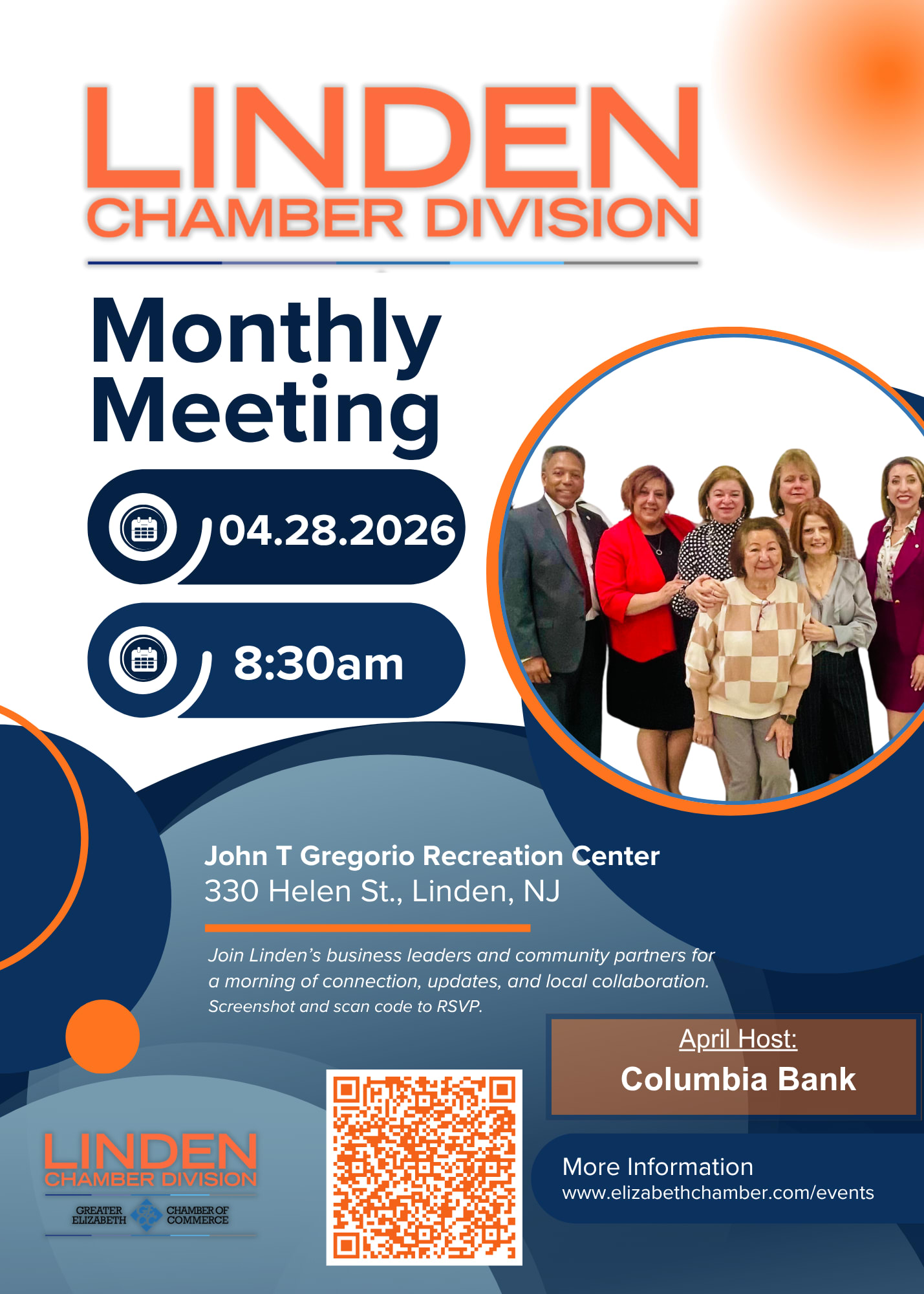 Our next GECC Linden Chamber Division meeting will be Tuesday, April 28, 2026, 8:30 am at the John T Gregorio Recreation Center 330 Helen St., Linden, NJ RSVP is needed for headcount. If you have already responded no need to reply again. Thank you in advance. Please invite any Business you feel might be interested in our Chamber.