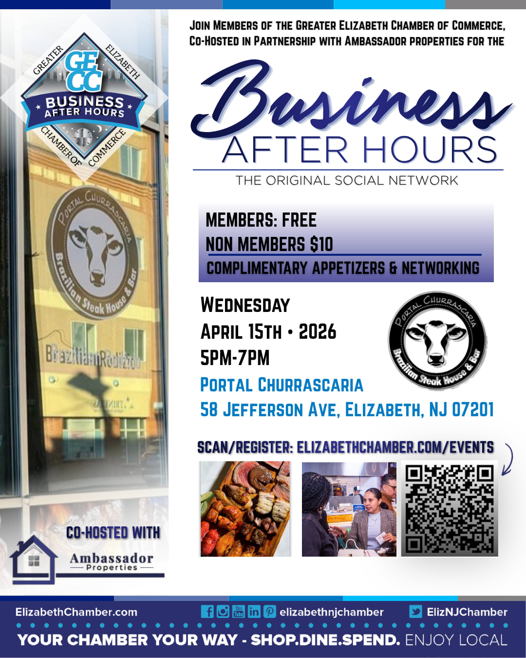 The evening includes food, networking, and a cash bar for beverages at Portal Churrascaria, 58 Jefferson Avenue, Elizabeth, NJ.