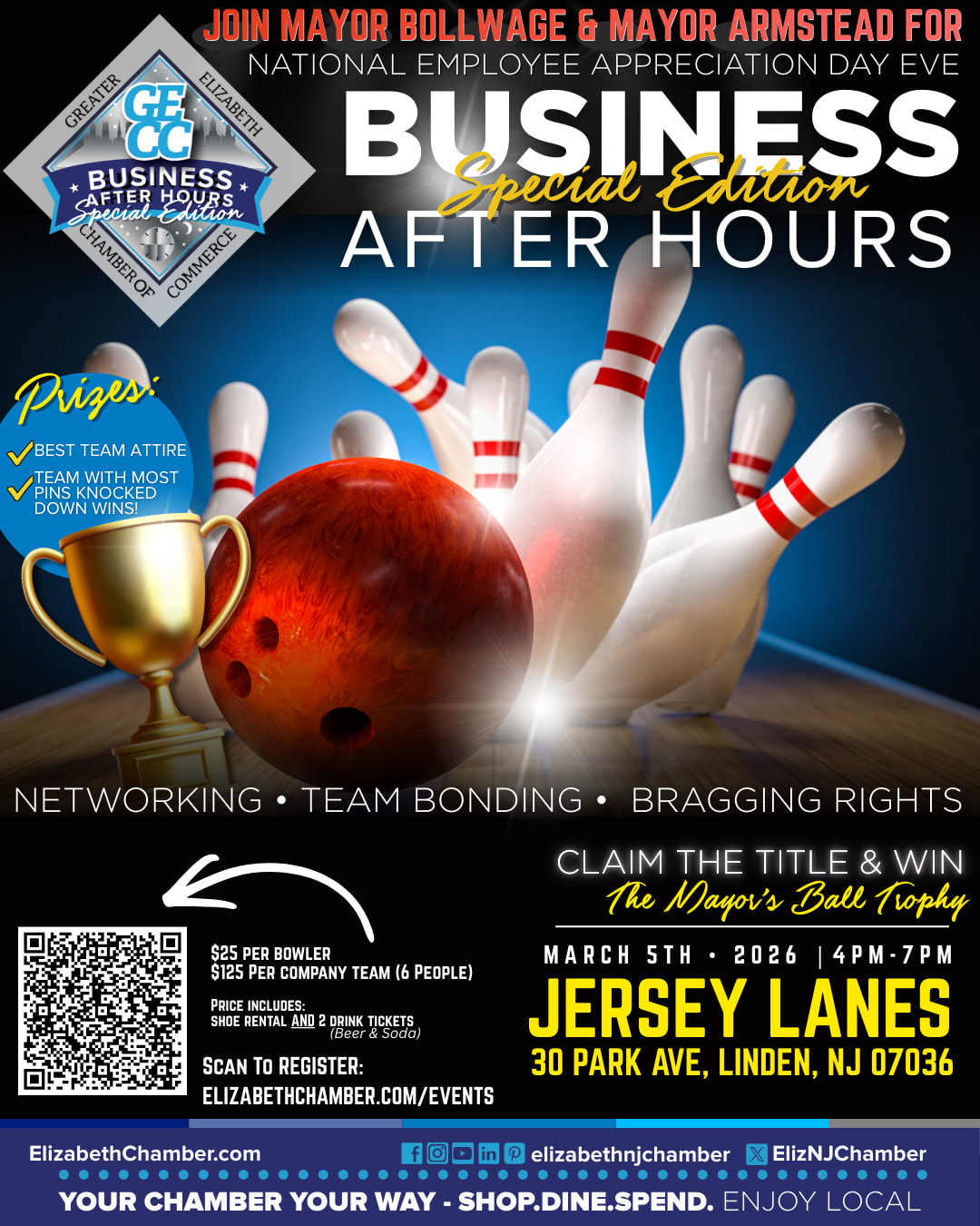 Ready to trade the boardroom for the bowling alley? The Greater Elizabeth Chamber of Commerce invites you to our Special Edition Business After Hours Bowling Tournament!