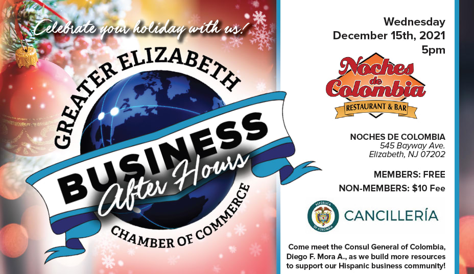 Join the Greater Elizabeth Chamber of Commerce [GECC] for the December Holiday Party held at Noches de Colombia. Wednesday, December 15th, 2021 from 5-7 PM. Register today!