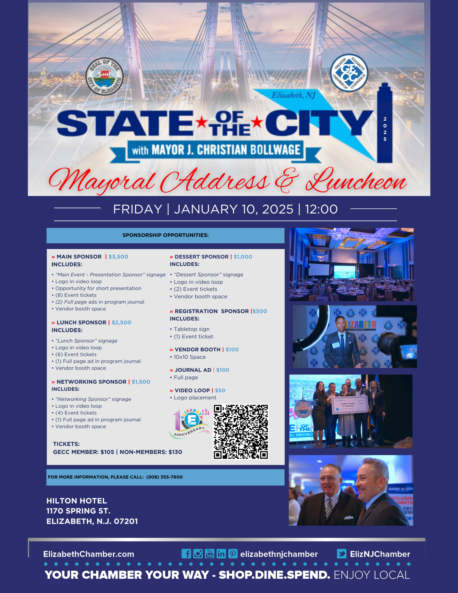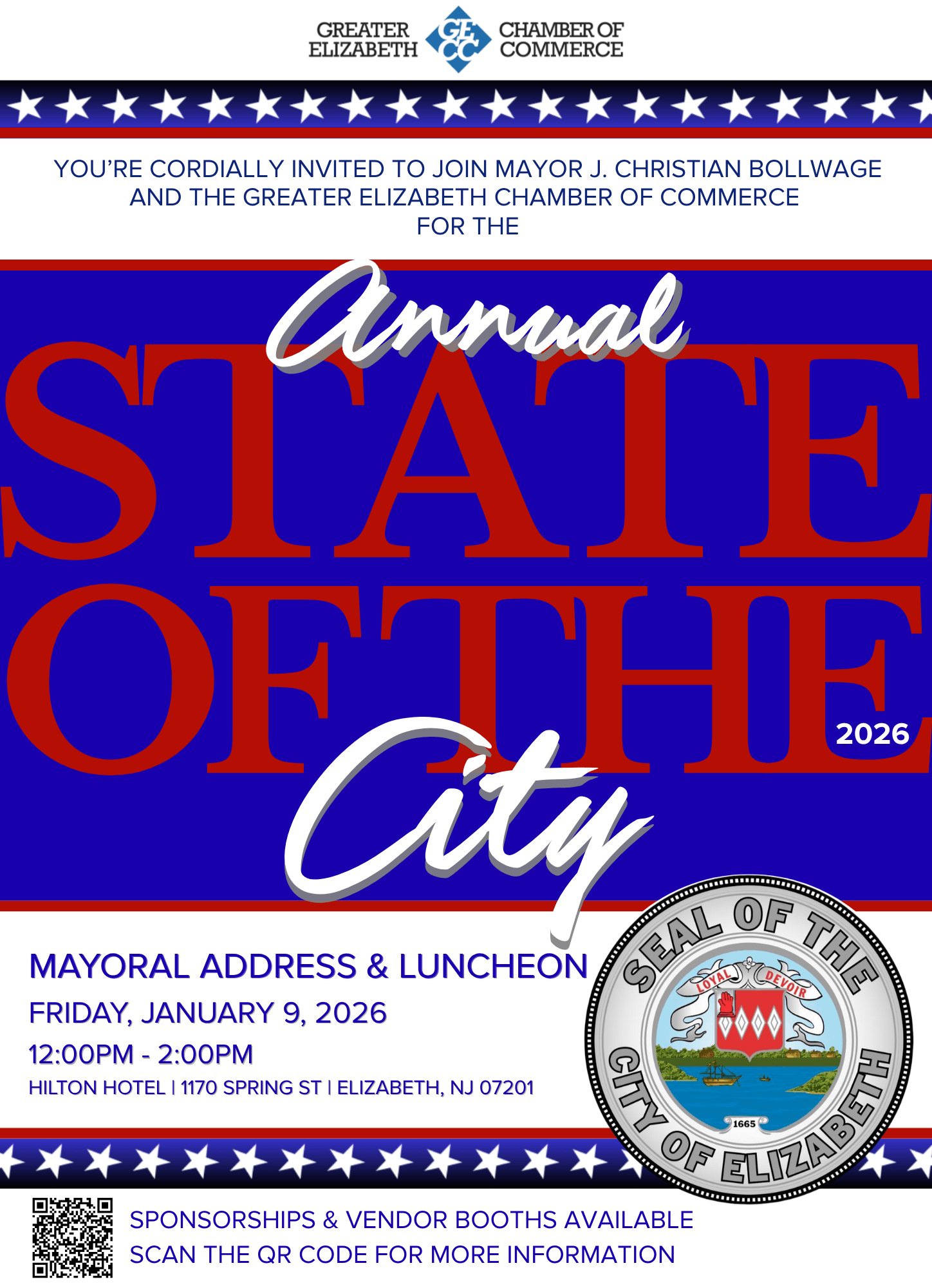 You are cordially invited to join Mayor J. Christian Bollwage And the Greater Elizabeth Chamber of Commerce for the Annual State of the City Luncheon
