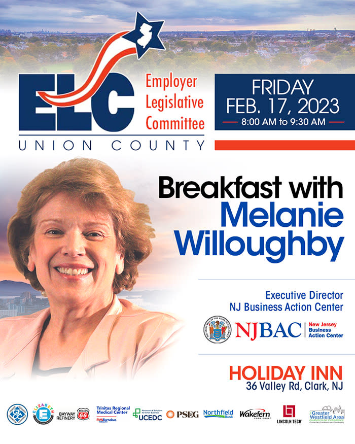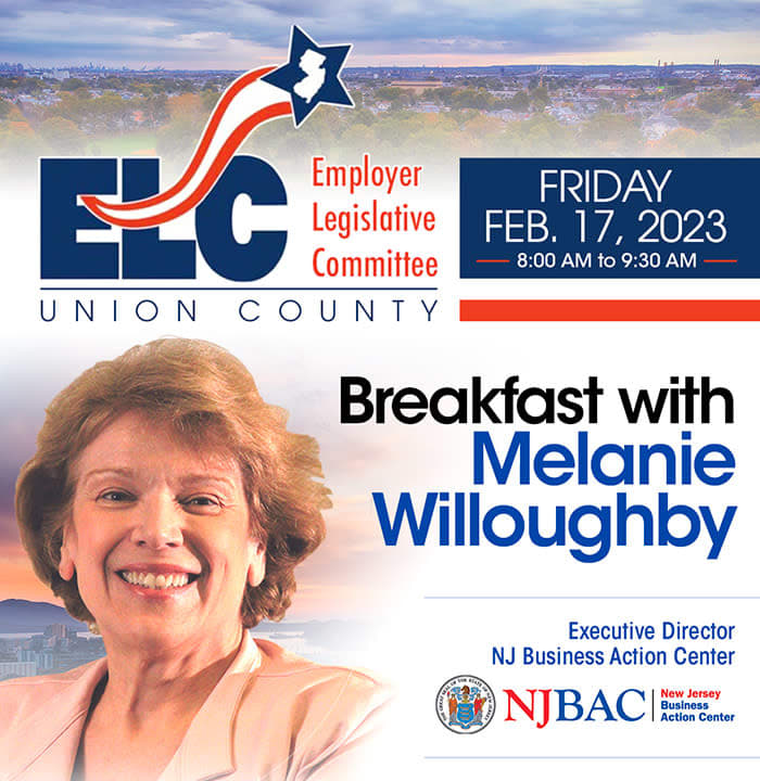 Union County Employers Legislative Committee (ELC) invites you to join us Friday morning, February 17th, from 8:00 - 9:30 am for breakfast and a presentation by New Jersey Business Action Center Leader, Melanie Willoughby. MS. Willoughby was named one of New Jersey's most influential economic development leaders in 2021. Before joining the NJBAC in 2018, Melanie served as the Chief Government Affairs Officer of the New Jersey Business & Industry Association (NJBIA). A seasoned government relations strategist, Melanie has worked with state and local levels of government as an advocate for businesses of all sizes.