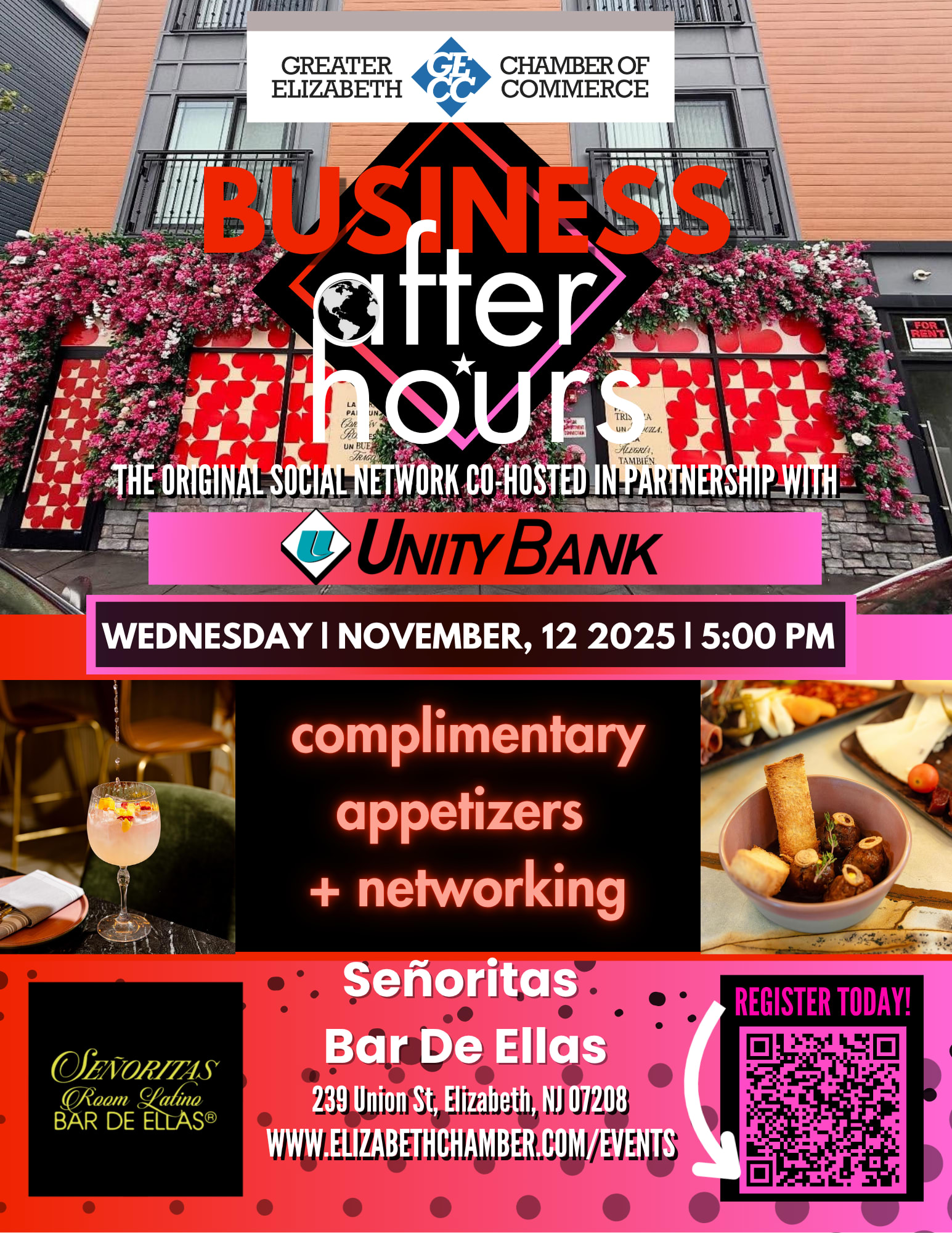 The evening is complete with food, networking, and a cash bar for beverages at Señoritas Bar de Ellas, 239 Union Street, Elizabeth, NJ 07208. Mingle with your fellow GECC Members and guests in a relaxed, welcoming environment. This event is co-hosted in partnership with our main event sponsor, Unity Bank.